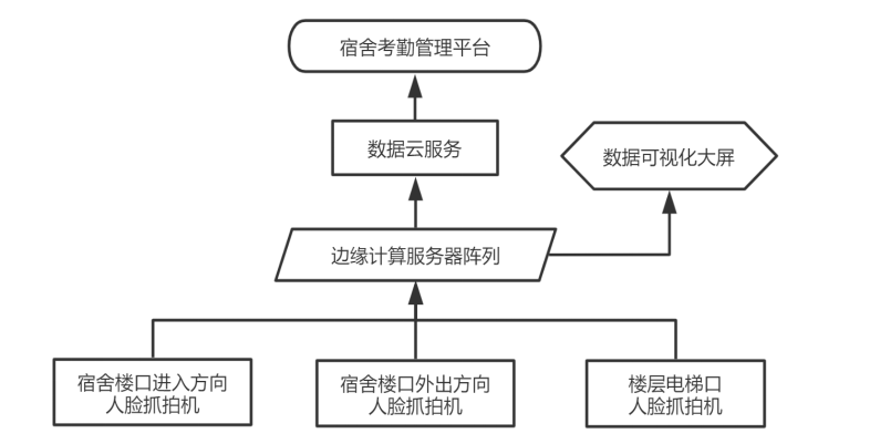 基于本校宿舍基本情況,結(jié)合學(xué)校運(yùn)營管理模式,將宿舍考勤系統(tǒng)軟硬件模塊按照如下架構(gòu)圖部署。綜合樓大門處出入兩方向根據(jù)樓道寬度分別安裝2-4個(gè)人臉識(shí)別抓拍機(jī),6-11樓層電梯口各安裝2-3個(gè)人臉識(shí)別抓拍機(jī),抓拍機(jī)視頻圖像數(shù)據(jù)通過網(wǎng)絡(luò)路由設(shè)備實(shí)時(shí)匯總*宿管邊緣計(jì)算服務(wù)器陣列,服務(wù)器將視頻流信息中解析出的人臉數(shù)據(jù)與校方學(xué)生人臉庫信息進(jìn)行實(shí)時(shí)N比N快速驗(yàn)證,獲得學(xué)生身份信息,將對(duì)比結(jié)果實(shí)時(shí)顯示在數(shù)據(jù)可視化大屏上。結(jié)合學(xué)??记诩八奚峁芾?/span>邏輯,將各維度報(bào)表分析推送*云服務(wù)器,校方管理人員可通過宿舍考勤管理平臺(tái)獲取數(shù)據(jù)分析結(jié)果。